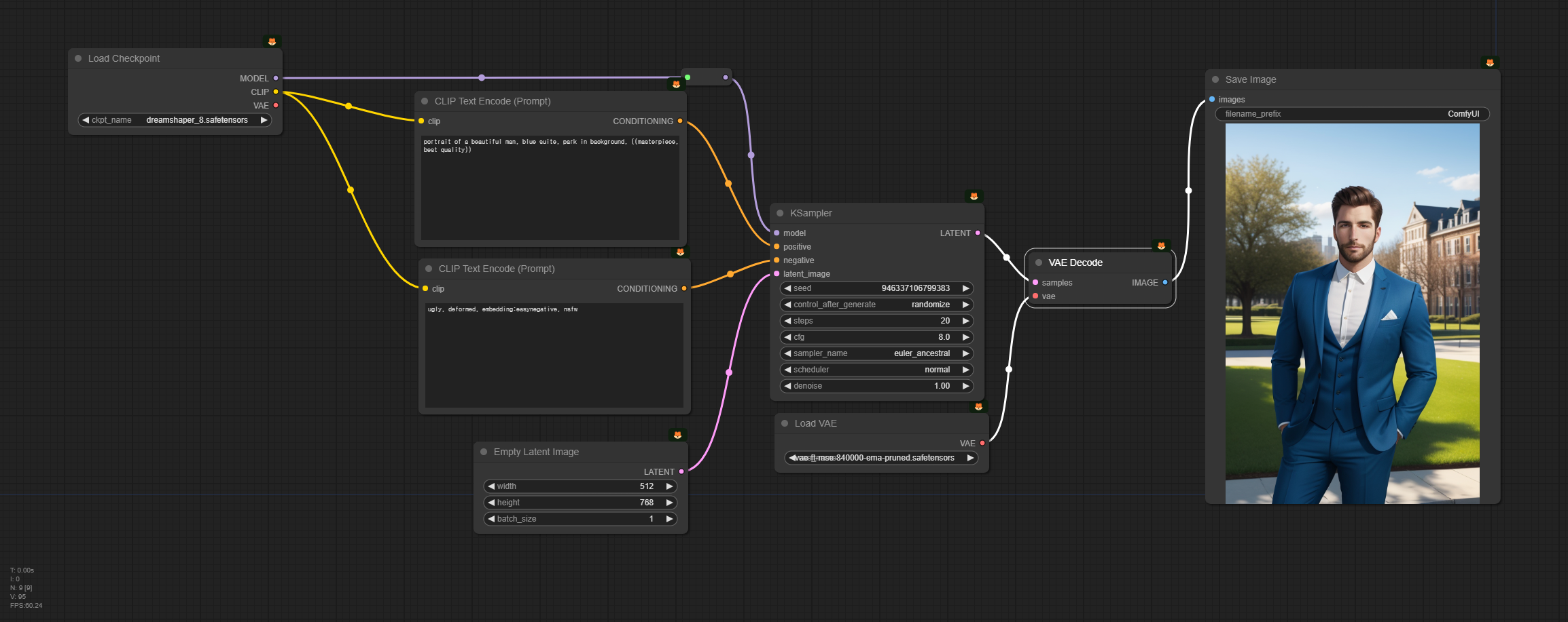 아래는 파란 양복을 입은 남성을 생성하는 기본적인 워크플로입니다.