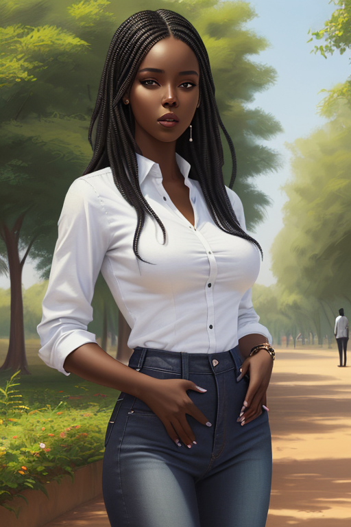 프롬프트: beautiful woman wearing jeans and a white shirt, standing in a park, digital paiting, masterpiece highly detailed