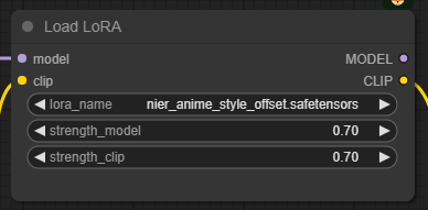 또한 [Load Lora] 노드에는 아래와 같이 LoRA에 대한 가중치(strength_model)과 CLIP에 대한 가중치(strength_clip)이 있으니 적절하게 조절할 수 있습니다.