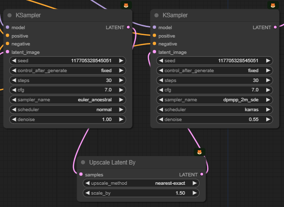 이 워크플로에서도 [KSampler]를 두번 실행시킵니다. 아래에서 좌우를 비교해보면, 샘플러를 다른 것(euler_ancestral과 dpmpp_2m_sed)을 사용하였고, 또한 잡음제거 강도가 처음은 1.0, 나중은 0.55를 적용하였음을 알 수 있습니다.