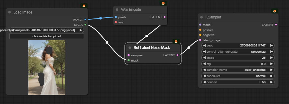 위쪽의 [VAE Encode]는 마스크 하기전의 이미지를 잠재 이미지로 변환합니다. [Set Latent Noise Mask] 노드는 이 잠재 이미지와 [Load Image]에서 생성한 마스크를 합쳐서, 마스크가 존재하는 잠재 이미지로 만들어 [KSampler] 노드로 넘겨주는 것입니다.