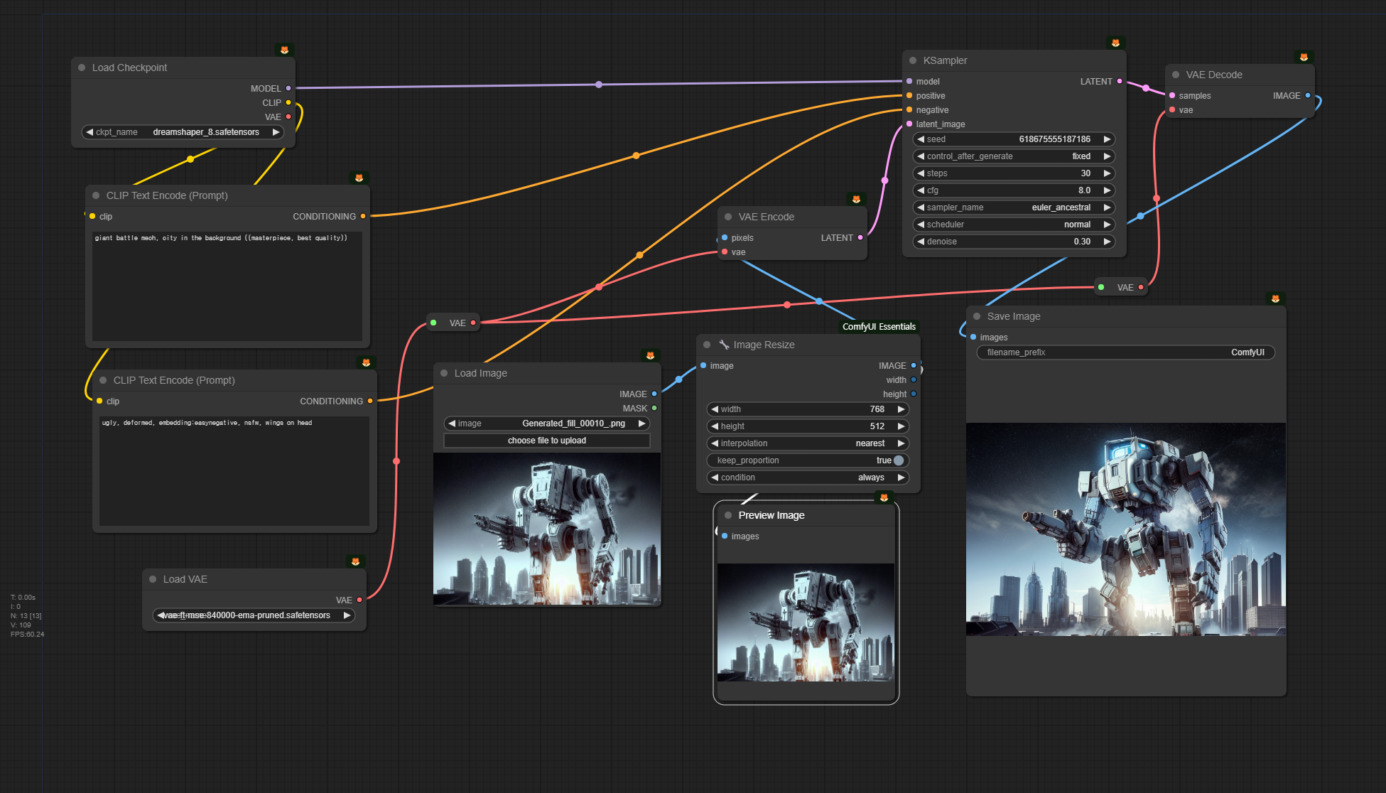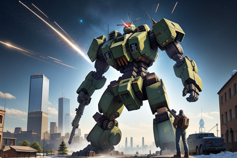 아래는 이 워크플로를 그대로 사용해 생성한 이미지입니다. 디테일은 다르지만 전체적으로 비슷한 형태의 거대 전투 로봇이 생성되었습니다. 이렇게 비슷한 이미지가 생성된 것은 잡음제거 강도(denoise)를 0.3으로 상당히 낮게 설정하였기 때문입니다.