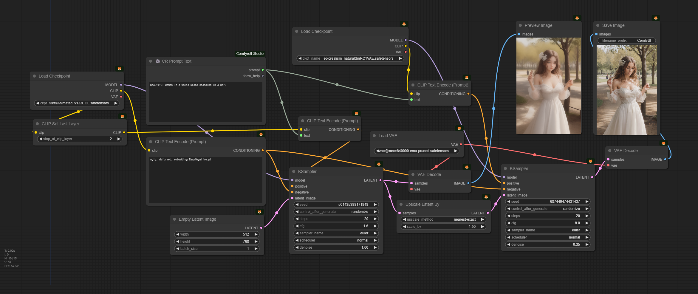 기본적으로 이 워크플로는 두 개의 체크포인트 모델을 사용하는 방법입니다. 이렇게 두개의 모델을 사용하는 이유는 revAnimated 모델이 색감과 구도가 좋게 나오기 때문에 사용한 것이고, 이렇게 생성된 이미지를 n>epicRealism 모델을 사용해서 실사 사진에 가깝게 만들고자 하는 것이라고 합니다.