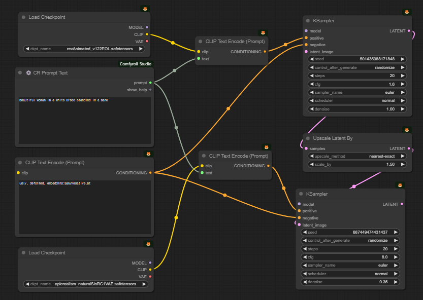 위의 워크플로에서 가장 중요한 부분은 [KSampler] 노드가 두개 있는데, 첫번째 [KSampler] 노드에서 나온 결과를 두번째 [KSampler]에서 받아 다시 한번 샘플링하는 부분입니다. 사실 이렇게 [KSampler] 노드가 두개 있는 경우는 레슨 3: 잠재 이미지 확대에서도 보았으므로 처음은 아닙니다. 다만 여기에서는 앞쪽과 뒤쪽 노드가 각각 다른 모델을 사용한다는 점이 독특합니다. 즉, 앞쪽 [KSampler]n> 노드는 revAnimated 모델을, 뒤쪽 [KSampler] 노드는 epicRealism 모델을 사용합니다.