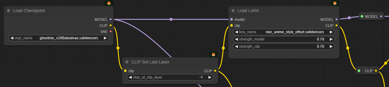 아래는 위의 LoRA 워크플로중에서 윗부분에 있는, 단독 LoRA 사용법입니다. 적용 순서는 [Load Checkpoint] -> [CLIP Set Last Layer] -> [Load LoRA] -> [CLIP Text Encode] 로 연결하면 됩니다.