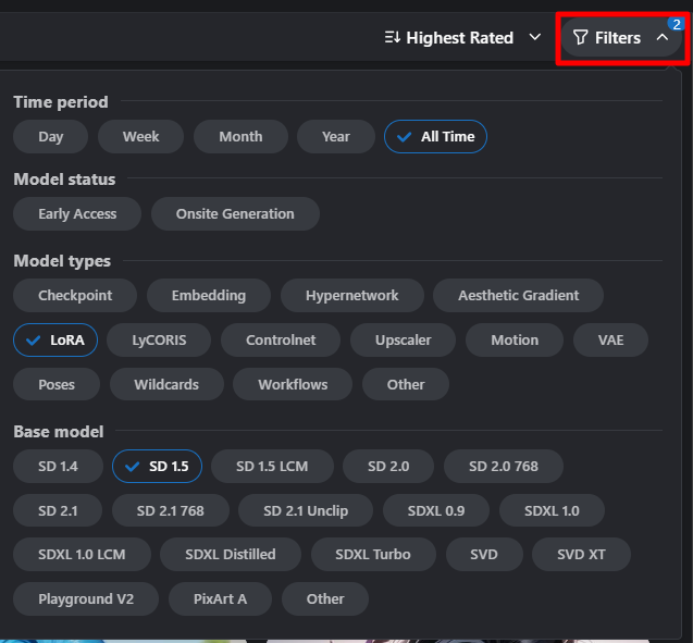 LoRA 모델도 체크포인트 모델과 마찬가지로 Civitai.com에 많습니다. 먼저 https://civitai.com/models 에 들어가서 오른쪽에 있는 필터(Filters)를 누르면 원하는 모델만 볼 수 있습니다. 아래는 SD1.5용 LoRA만 필터링하는 예입니다.