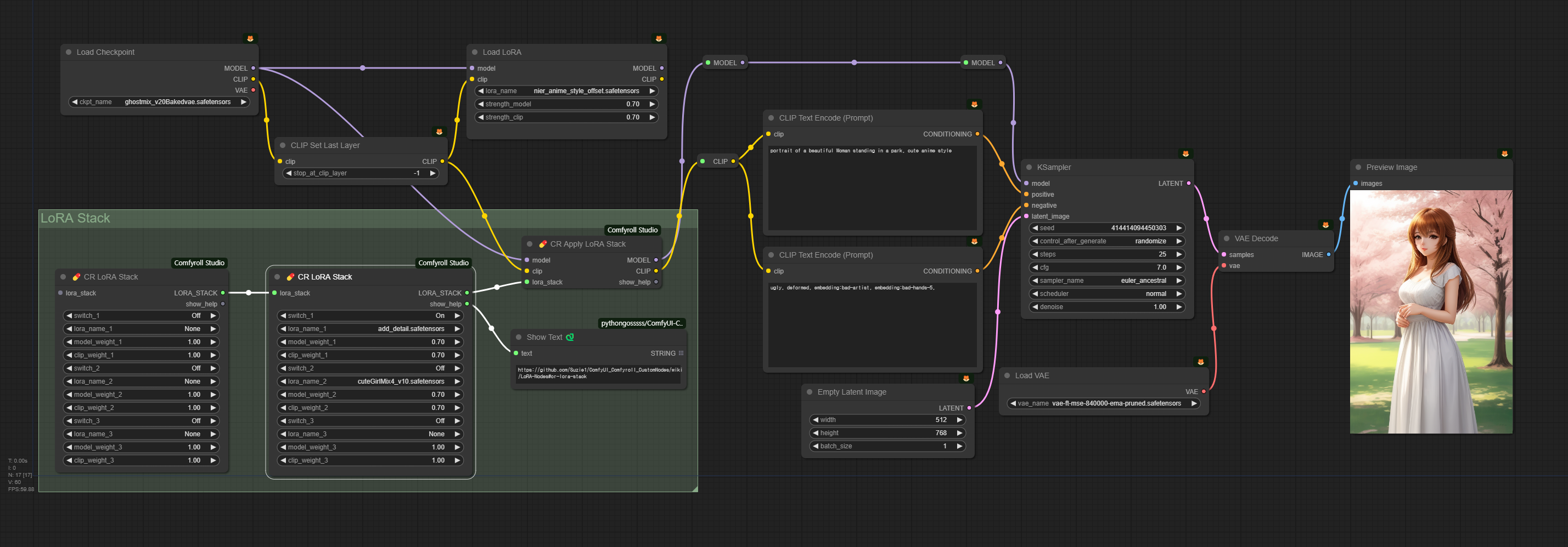 위의 워크플로 아래쪽에는 여러개의 LoRA를 한꺼번에 지정할 수 있는 [CR Loara Stack] 과 [CR Apply LoRA Stack] 노드를 사용하고 있습니다. 사용방법은 [Load Checkpoint] -> [CLIP Set Last Layer] 다음에 [CR Apply Lora Stack] -> [CLIP Text Encode]로 연결하고, [CR Loara Stack] 은 [CR Apply LoRA Stack] 에 연결해 주면 됩니다.