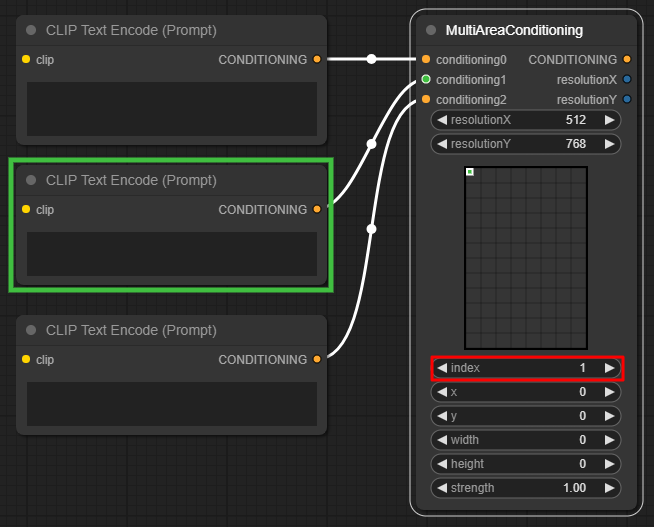 프롬프트가 적용되는 영역은 아래쪽에 있는 입력 위젯을 사용해 편집할 수 있습니다. 먼저 해당되는 index의 좌우 삼각형을 눌러 적용할 구역을 지정합니다.아래는 index 를 1로 지정할 때의 모습입니다.  index를 바꿔주면 좌측과 같이 연결된 프롬프트가 강조되므로 쉽게 구분할 수 있습니다.