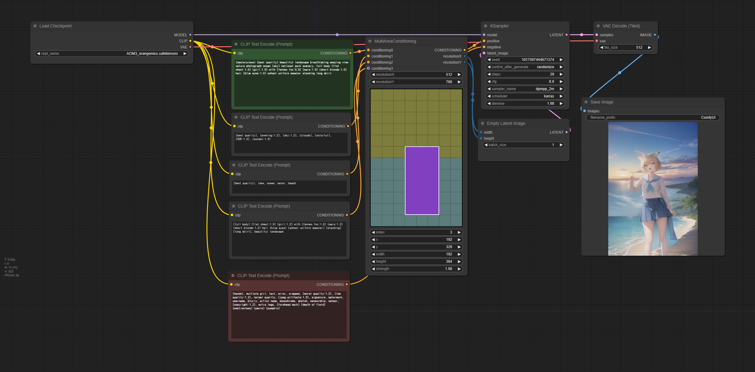 이 커스톰 노드 사이트에 들어가보면 Hires Fix 기법을 사용해 좀 더 나은 이미지를 생성하는 워크플로도 있으니 참고하세요. 그리고 이 [MultiAreaConditioning] 노드를 사용해 구역 프롬프트를 구현하는 방법은 ComfyUI - 영역 분할 프롬프트 사용 방법을 읽어보시기 바랍니다.