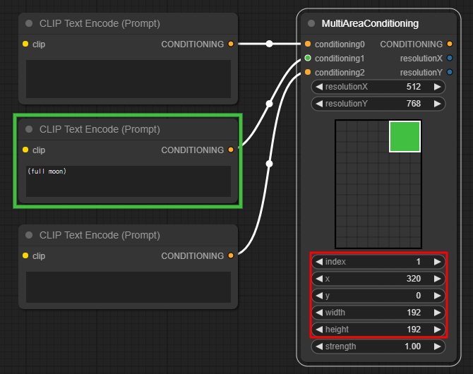 다음으로  x와 y 의 좌우 삼각형을 눌러서 영역의 시작점을 변경하고, width/height를 눌러 면적을 지정합니다. 눌러보면 아실겁니다. 아래는 (0,192)에서 (192, 384)의 정사각형에 (full moon)이라는 프롬프트를 지정한 것입니다.