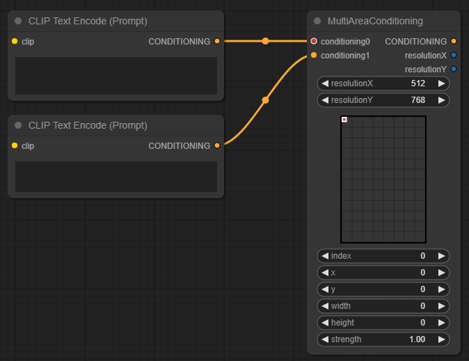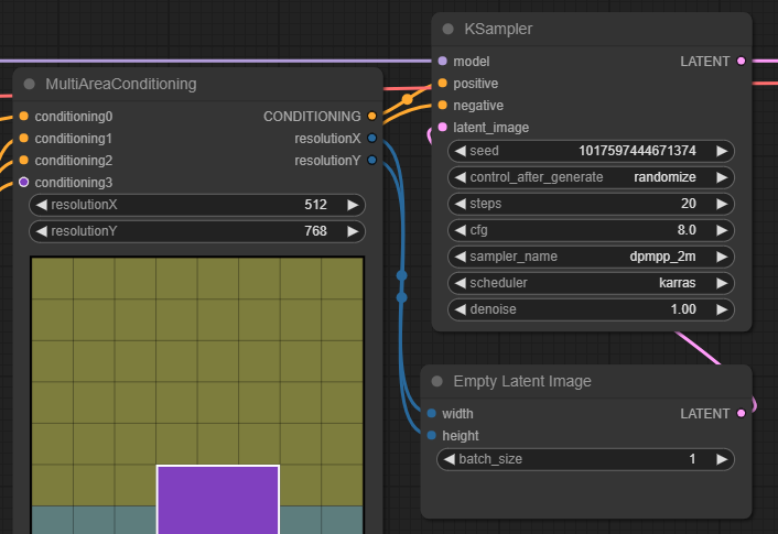 유의할 부분은 아래와 같이 [Empty Latent Image] 노드를 [MultiAreaContioning]노드 다음에 배해서 resolutionX/resolutionY를 width/height로 연결해줘야 한다는 점입니다. (입력 위젯을 입력 슬롯으로 바꾸려면 해당 노드를 우클릭해서 convert 하시면 됩니다)