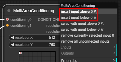 입력 슬롯에는 conditioning0, conditioning1 등 2개가 있습니다. 이 슬롯은 각각 [CLIP Text Encode] 노드 등의 프롬프트 입력노드와 연결해야 합니다. 구역의 갯수를 늘리려면, [MultiAreaConditioning]  노드를 우클릭하여 메뉴를 부르고, 아래와 같이 "insert input above 0" 또는 "insert input below 0" 버튼을 눌러주면 됩니다. 0이라는 번호는 현재 편집중인 슬롯입니다(아래를 보세요) - 아래에 있는 swap/remove를 사용하면 이동/삭제가 가능합니다.