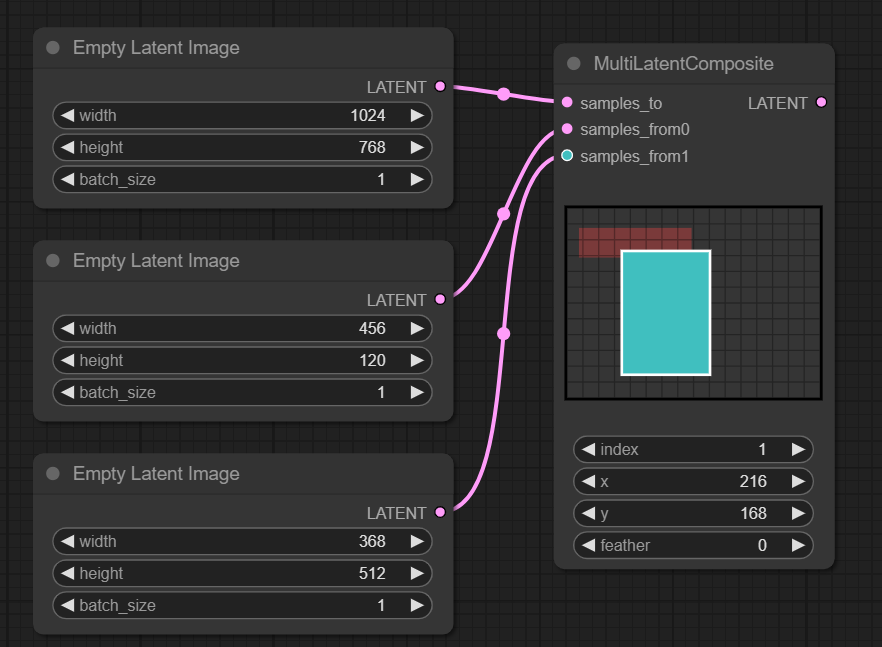 부분 이미지들은 [MultiLatentComposite] 노드의 아래쪽에서 위치를 지정해서 (크기는 원래 잠재 이미지의 크기를 사용하므로 변경할 수 없습니다) 배치를 지정합니다.
