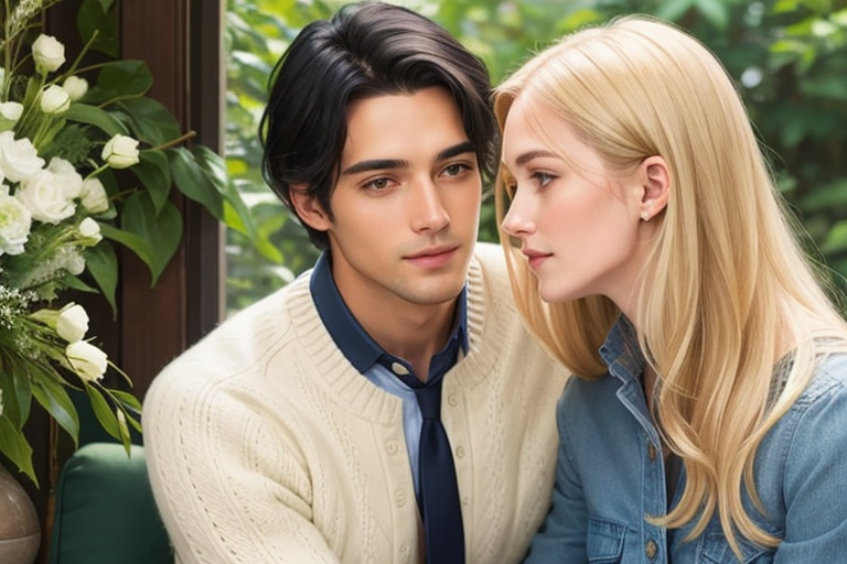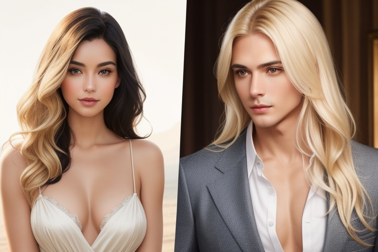 프롬프트: A picture with a man with black hair on the left and a woman with blonde hair on the right