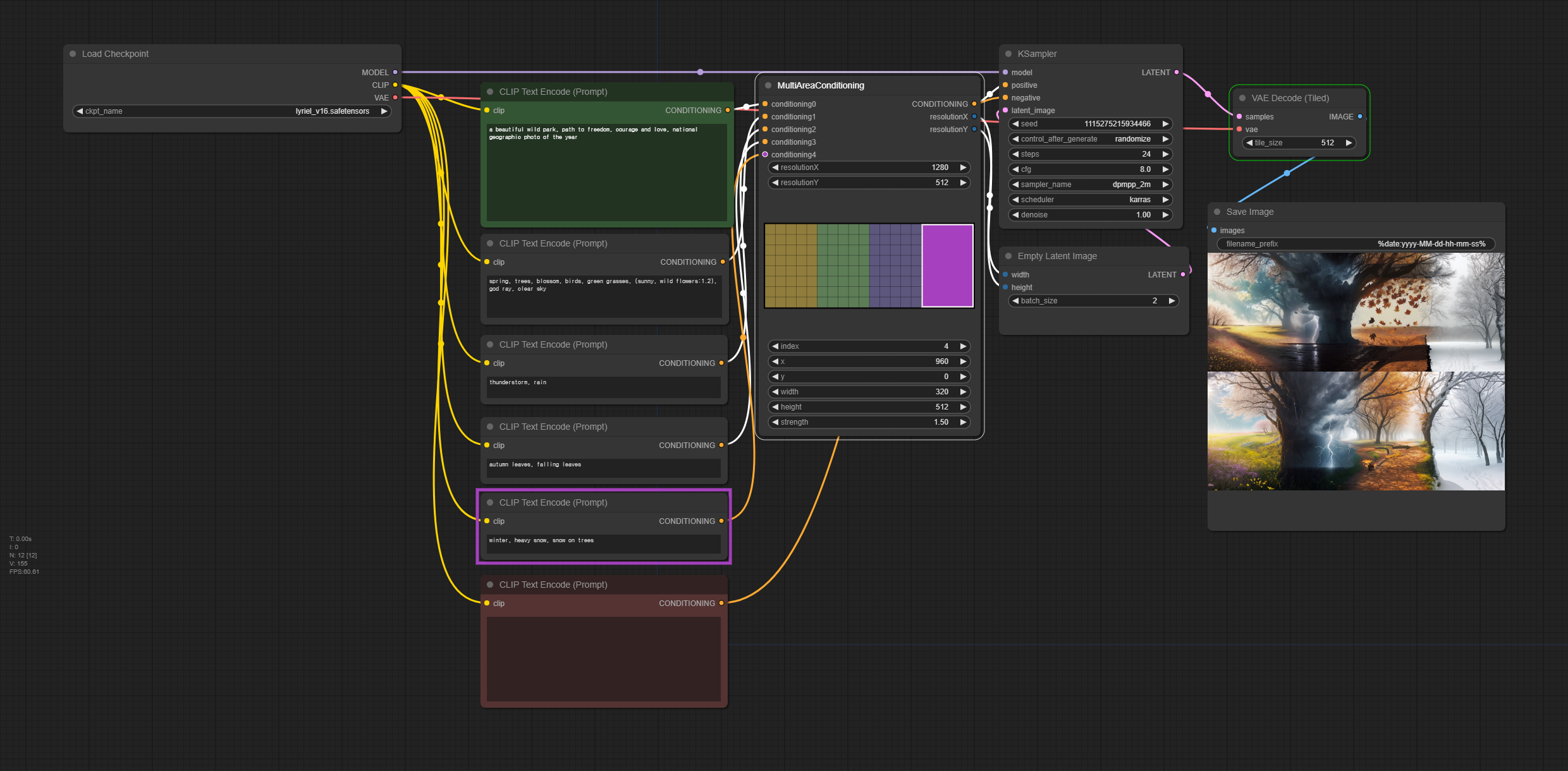 아래는 [MultiAreaConditioning] 노드를 사용해서 위에 있는 4분할 봄 여름 가을 겨울 워크플로를 구현한 것입니다. 보시는 것처럼 상당히 깔끔합니다. 특히 이 노드를 사용하지 않았을 때에 비하면 정말 보기도 좋고 이해도 쉽습니다.