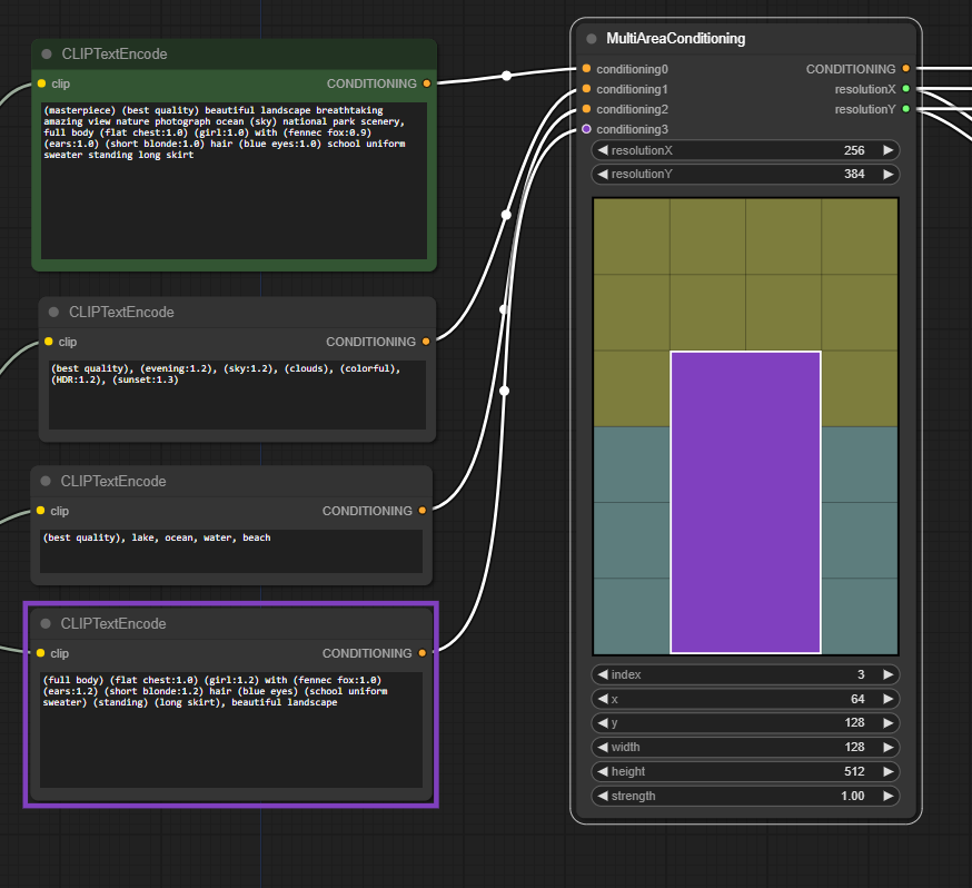 이 워크플로에서 가장 중요한 부분은 아래와 같습니다. 왼쪽엔 [CLIP Text Encode(Prompt)] 노드로 프롬프트를 작성하고, 그 다음엔 [Conditioning (Set Area)]로 이 프롬프트가 적용될 구역을 지정합니다. [width/height는 전체 이미지 크기이고, 그아래 x/y가 해당프롬프트가 적용되는 구역입니다. 아래의 이미지에서 위쪽은 0,0부터 적용된다는 거고, 아래쪽은 384,0부터 적용된다는 뜻입니다.