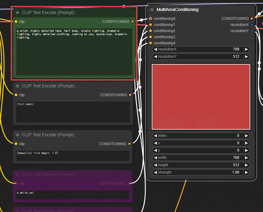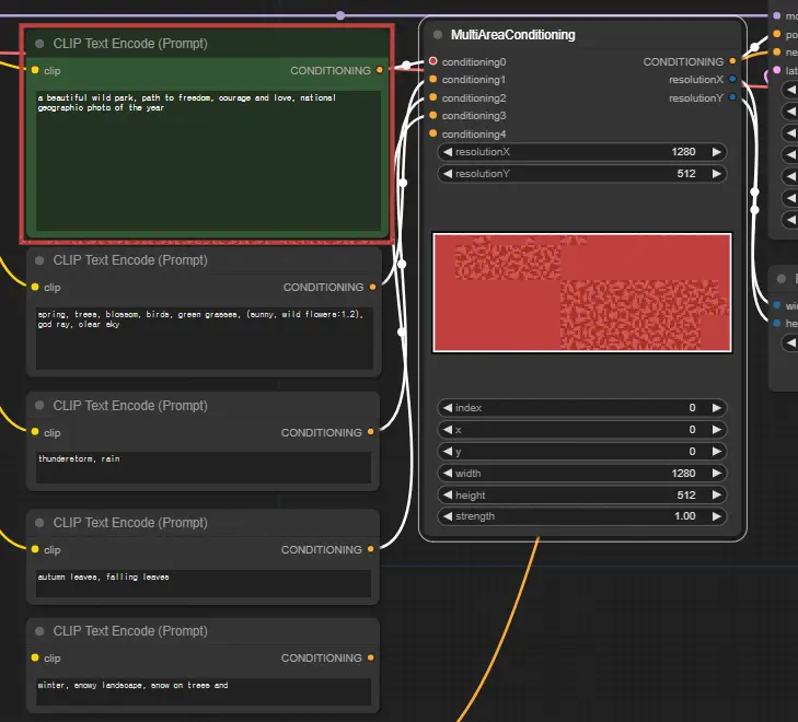 (참고: 불행히도 MultiAreaConditioning 커스톰 노드가 더이상 지원되지 않습니다)