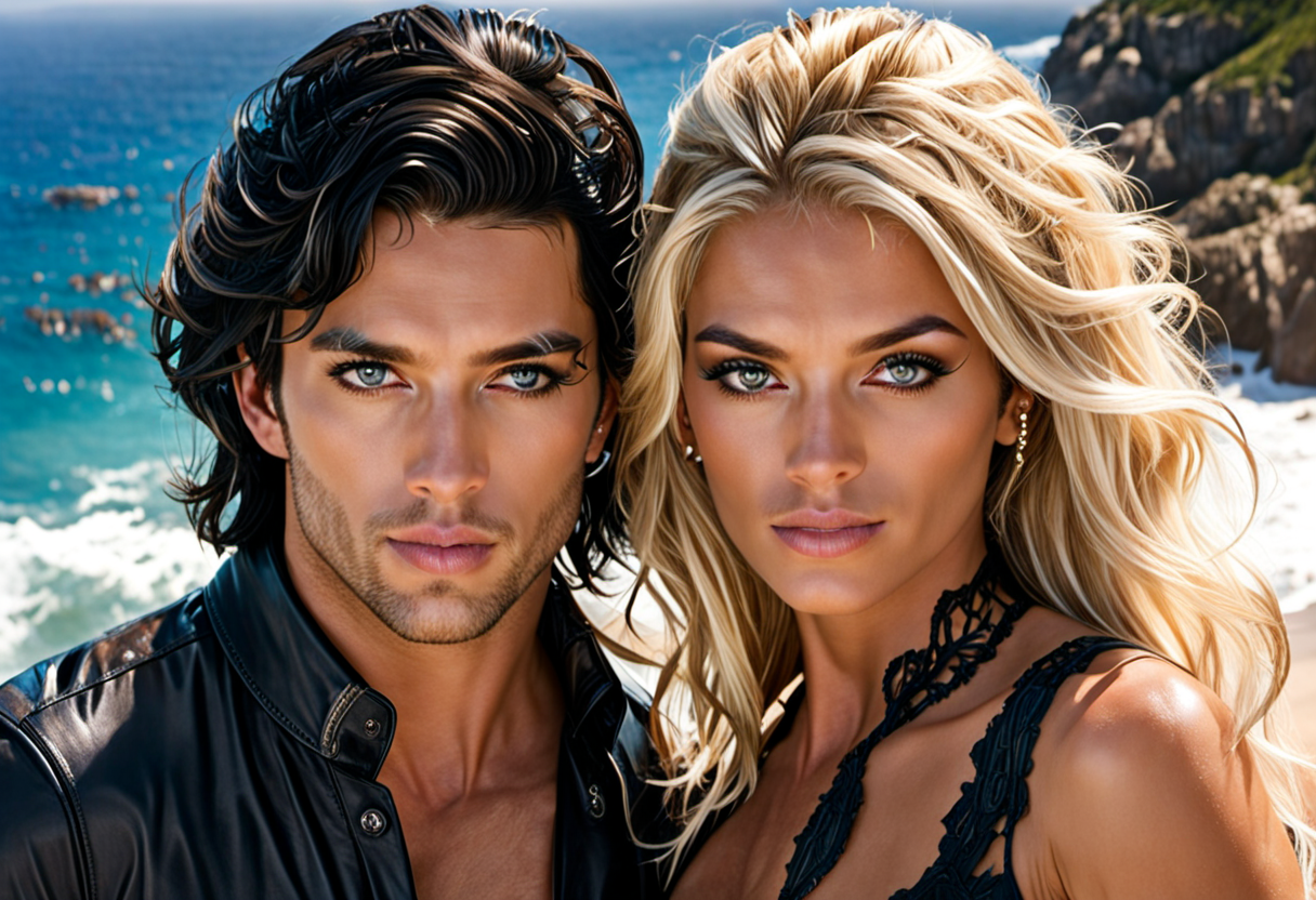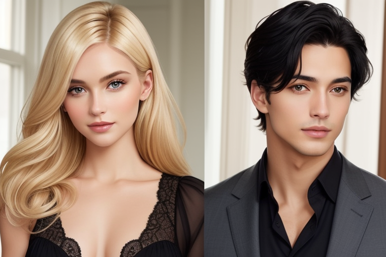 프롬프트: A picture with a man with black hair on the left and a woman with blonde hair on the right