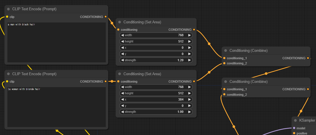 이 워크플로에서 가장 중요한 부분은 아래와 같습니다. 왼쪽엔 [CLIP Text Encode(Prompt)] 노드로 프롬프트를 작성하고, 그 다음엔 [Conditioning (Set Area)]로 이 프롬프트가 적용될 구역을 지정합니다. [width/height는 전체 이미지 크기이고, 그아래 x/y가 해당프롬프트가 적용되는 구역입니다. 아래의 이미지에서 위쪽은 0,0부터 적용된다는 거고, 아래쪽은 384,0부터 적용된다는 뜻입니다.