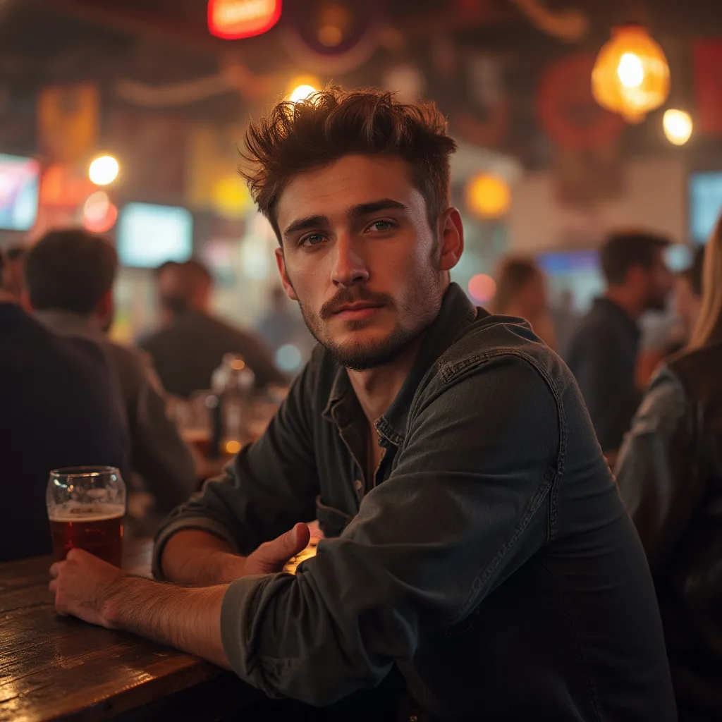 프롬프트: Portrait photo of a 25 year old american man in crowded pub (붐비는 술집에 있는 25세 미국인 남성의 인물 사진)