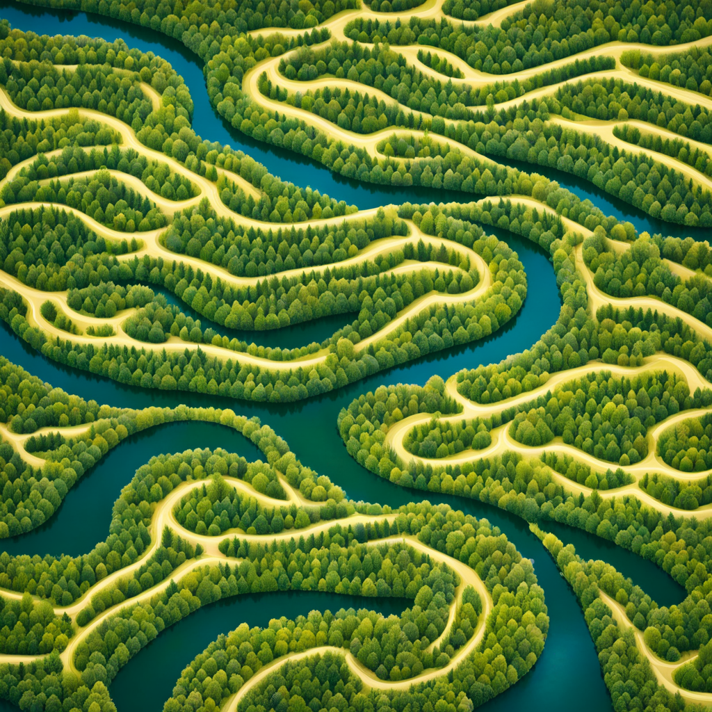 프롬프트: An aerial perspective of a vast forest landscape that forms a DNA double helix pattern, with rivers and clearings symbolizing its features.