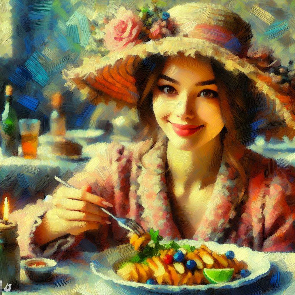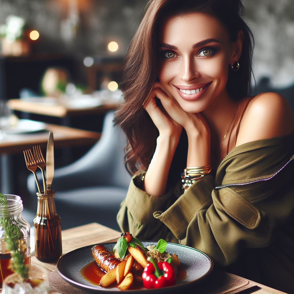프롬프트: a woman sitting at a table, a plate of delicious food, with a beautiful smile, with gorgeous detailed eyes, European face
