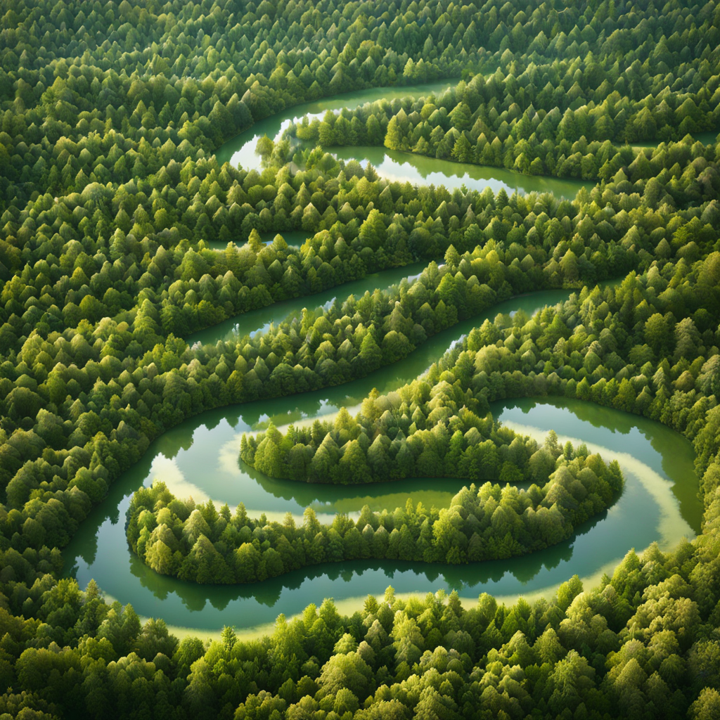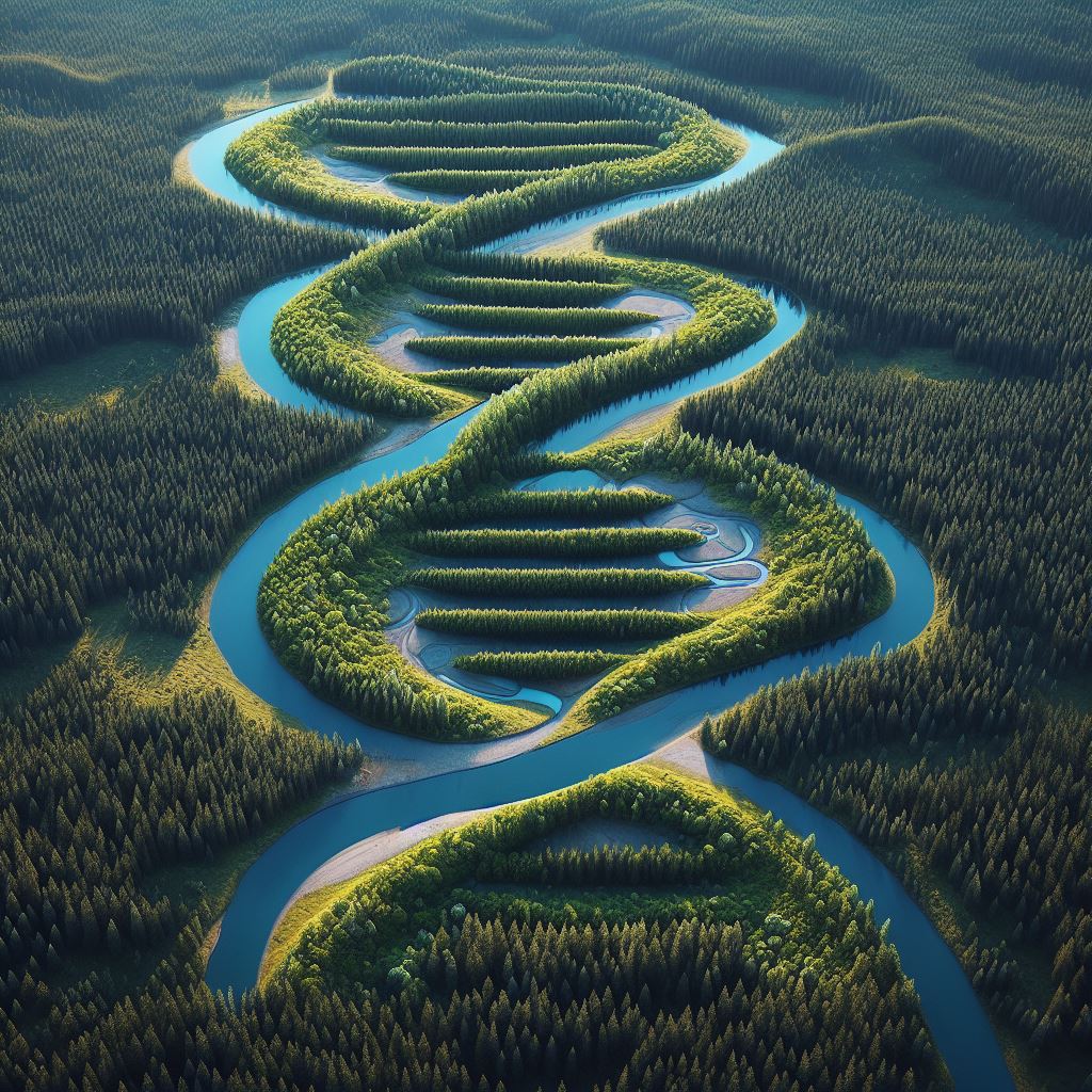 프롬프트: An aerial perspective of a vast forest landscape that forms a DNA double helix pattern, with rivers and clearings symbolizing its features.