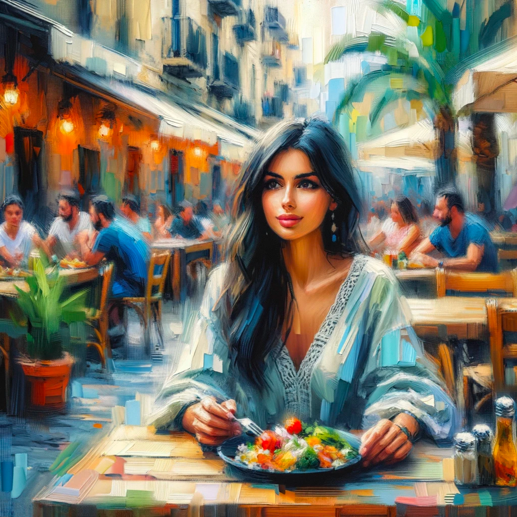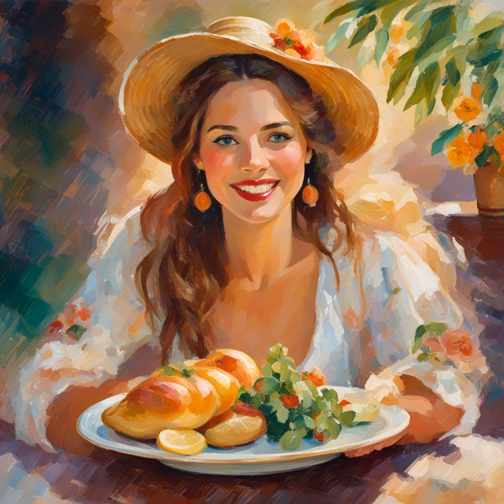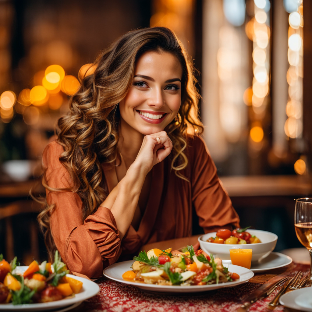 프롬프트: a woman sitting at a table, a plate of delicious food, with a beautiful smile, with gorgeous detailed eyes, European face