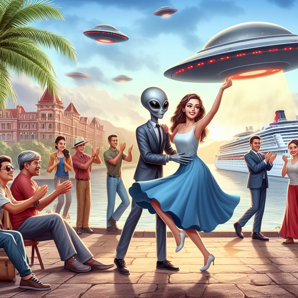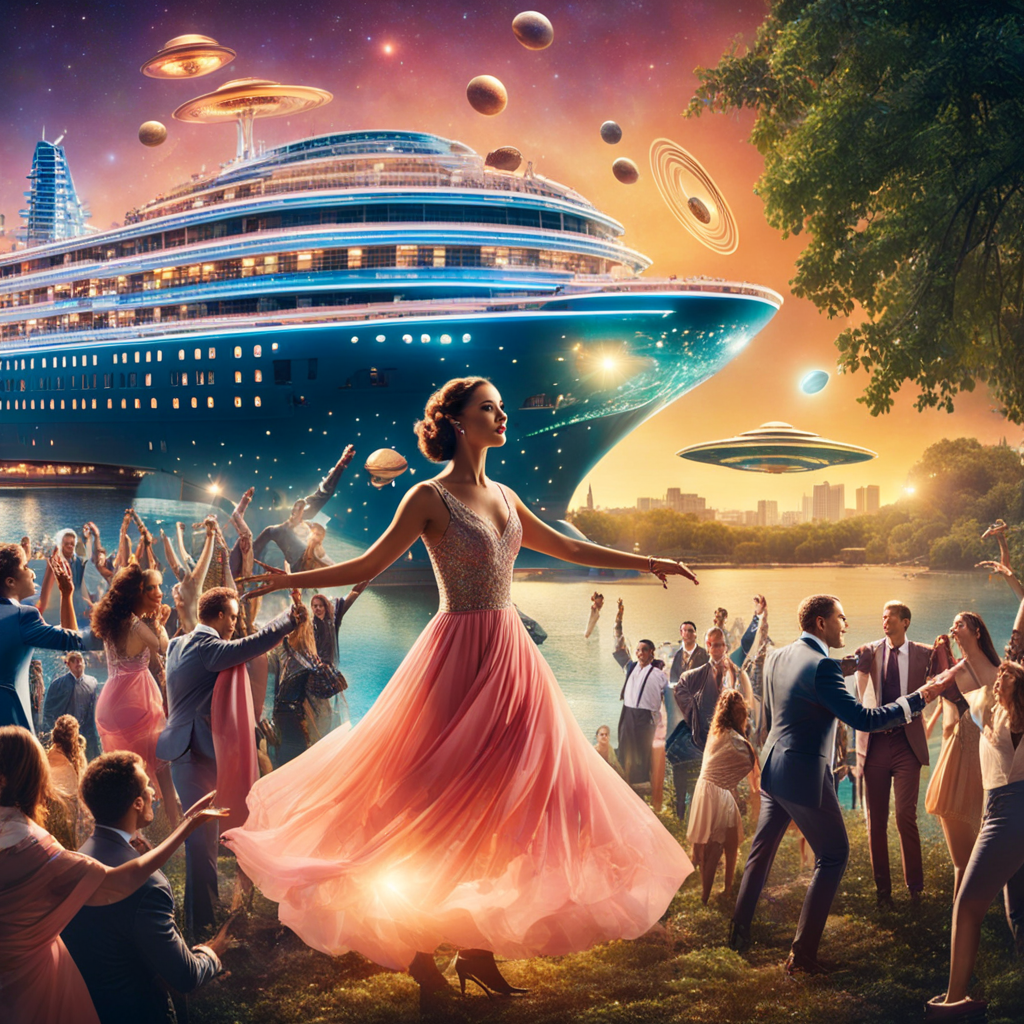 프롬프트: A beautiful lady dancing with aliens at a riverside park with many spectators clapping, flying saucers in the sky, and a cruise ship on the river