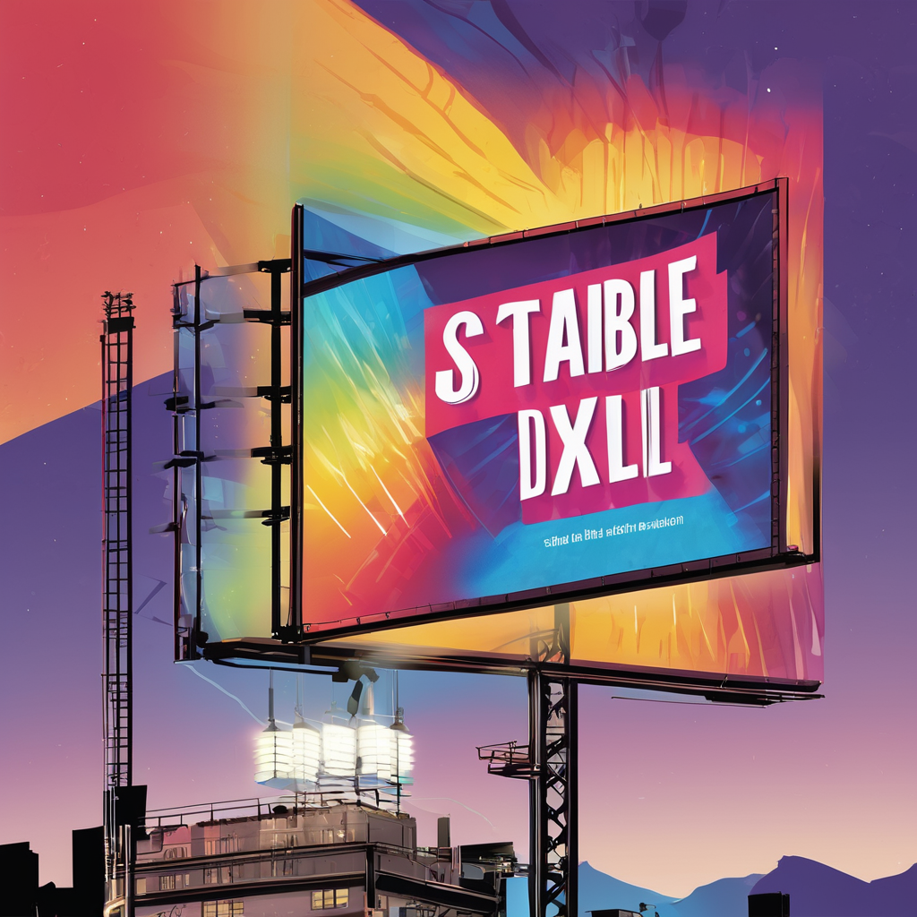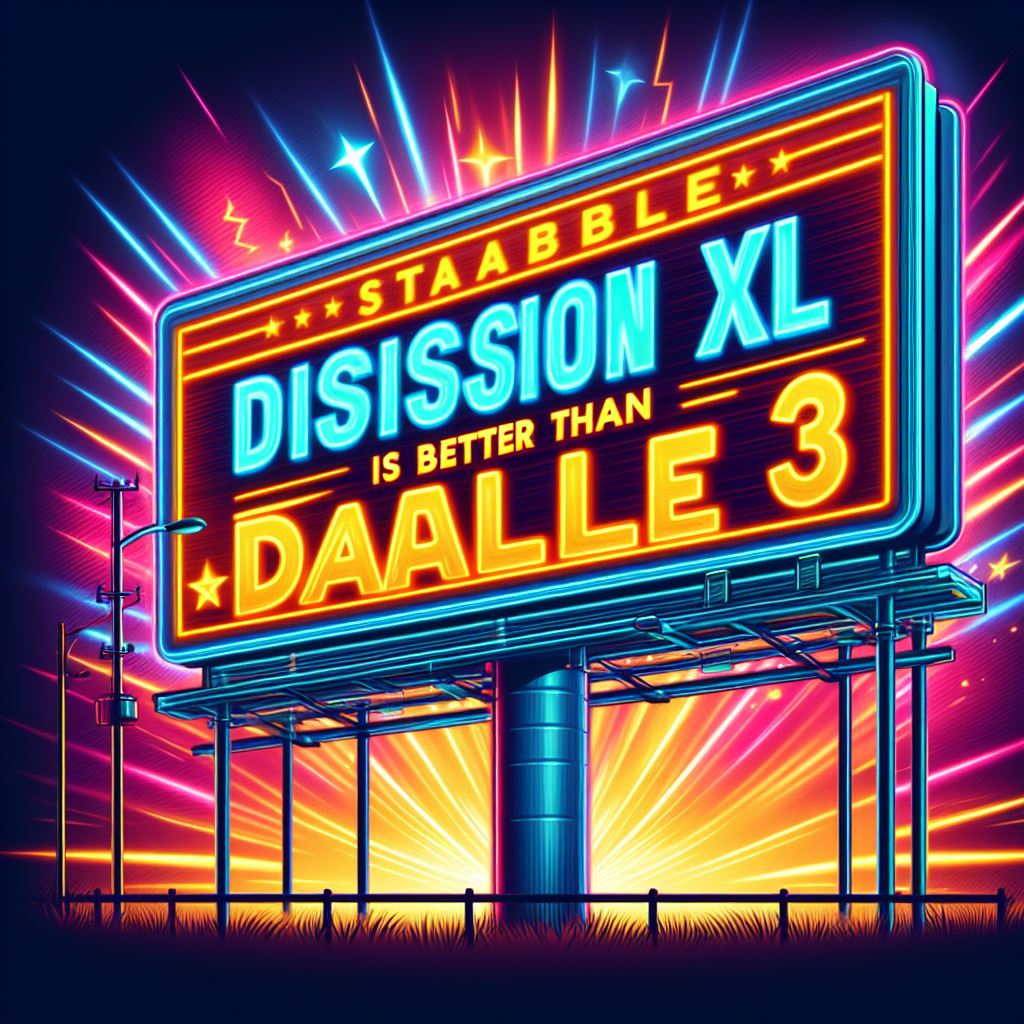프롬프트: An illustration of a vibrant billboard sign emphasizing the message “Stable Diffusion XL is better than DALLE 3” with radiant light beams.