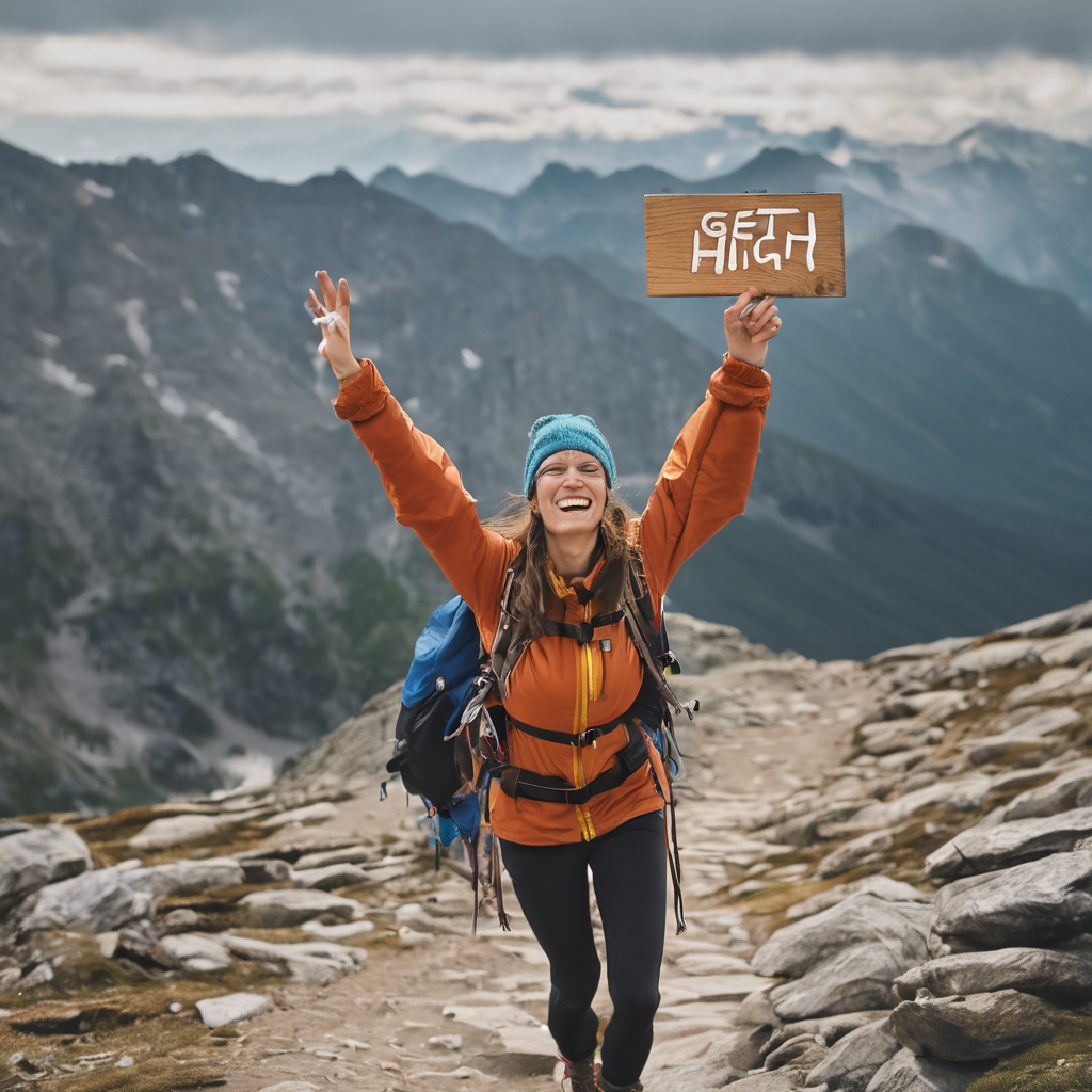 프롬프트: A female hiker triumphantly reaching the summit with a wooden sign reading “Get High”