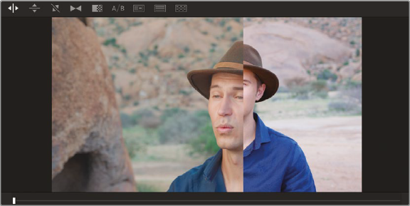 - 클립 11 선택. 뷰어 왼쪽 위에 있는 Image Wipe 버튼을 선택. Still 이미지와 비교 가능. 경계를 살짝 움직여서 얼굴이 겹치도록 조정