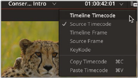 - 흰점도 비슷하게 하려는 데, 흰점은 치타의 꼬리에 있음. 먼저 뷰어 바로 위에 있는 숫자의 아래쪽 화살표를 눌러, Timeline Timecode를 선택