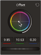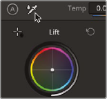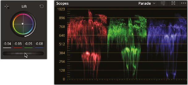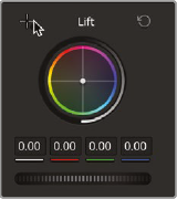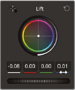 - 그다음 Lift를 사용해 어두운 쪽 조정. 그림자에 파란색이 많은 상태. Lift의 Color wheel 중심점을 끌어서 파란색이 멀어지는 방향으로.