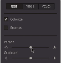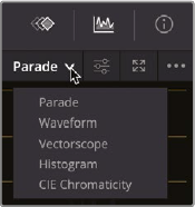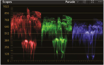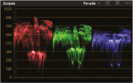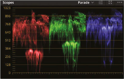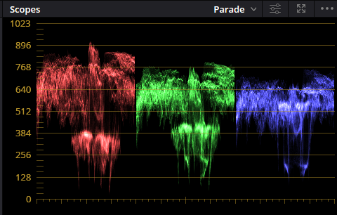 - Wavefrom, Parade, Vectorscope, Histogram, CIE 챠트등 다양한 스코프가 있음. 여기에서는 parade 사용