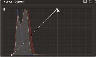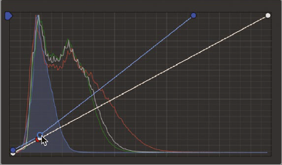 - 커브 왼쪽 아래의 흰 동그라미(black point)를 선택하여 오른쪽 히스토그램 시작지점에 가져다 놓으면 blue 채널이 거의 바닥에 닿는다(검은색이 검은색으로 된다). 우측위 동그라미를 선택해 red가 1024에 닿을때까지 좌측으로 이동.