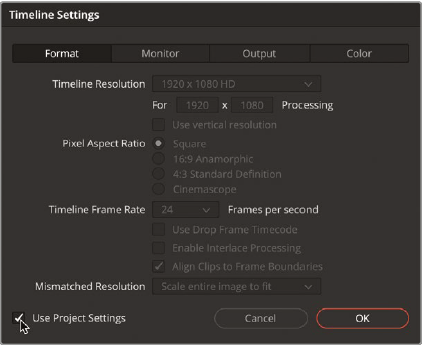 - 다이얼로그가 나오면 Use Project Settings 의 체크를 끄고 OK를 누르면됨. 다른 타임라인에서 설정을 바꿔도 이 타임라인은 그대로 유지됨