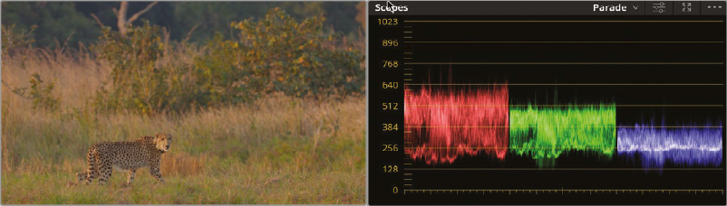 - 밝아졌기는 한데, 색이 주황색에 가까움. Parade에서는 R이 G/B에 비해 높기때문임. Gain의 컬러 휠의 가운데 점을 빨간색에서 멀어지는 쪽으로 조정할 것. Parade에서 R/G/B가 비슷한 높이가 되도록