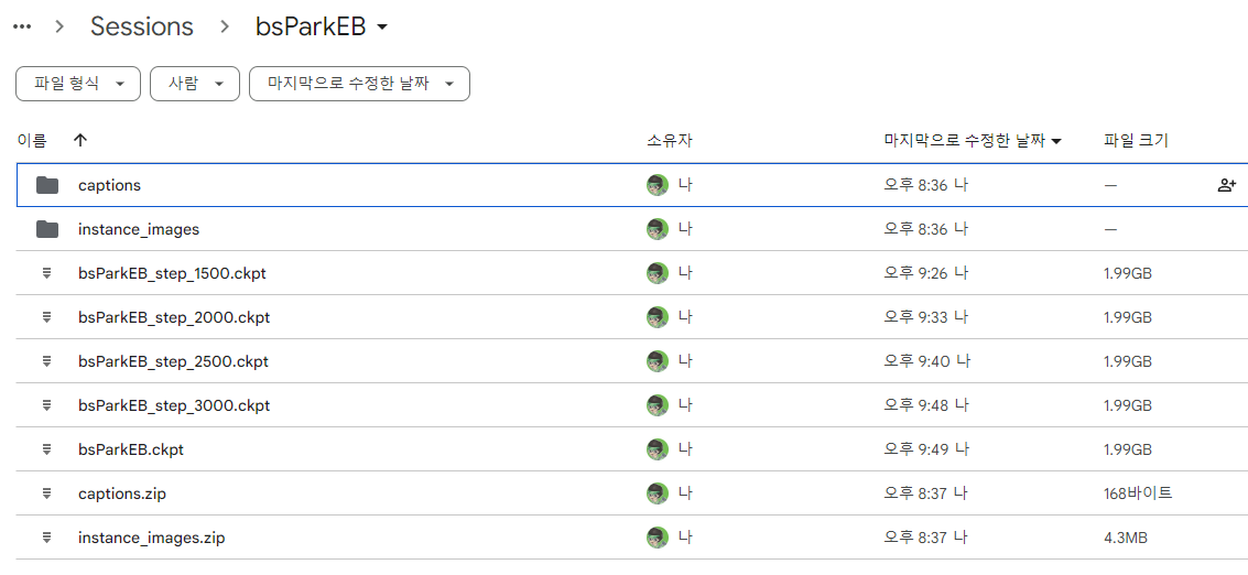 약 1시간 정도 걸려서 학습이 완료된 것 같네요. 학습이 완료되면, 구글 드라이브에 Fast-DreamBooth라는 폴더가 생기고, 그 안에 있는 세션명 폴더 속에 ckpt 파일이 생성됩니다. 아래는 생성결과입니다. 총 5개가 생성되었네요. 아마 bsParkEB_step_3000.ckpt와 bsParkEBckpt 파일은 동일하지 않을까... 싶습니다.