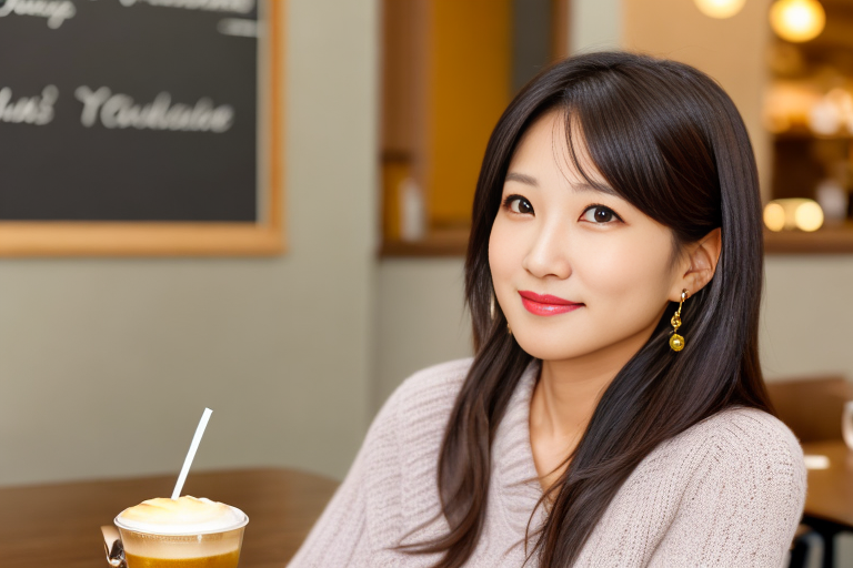 프롬프트: a photo of a bspeb, a beautiful woman sitting at a table, brown eyes, looking at me, atmospheric cafe