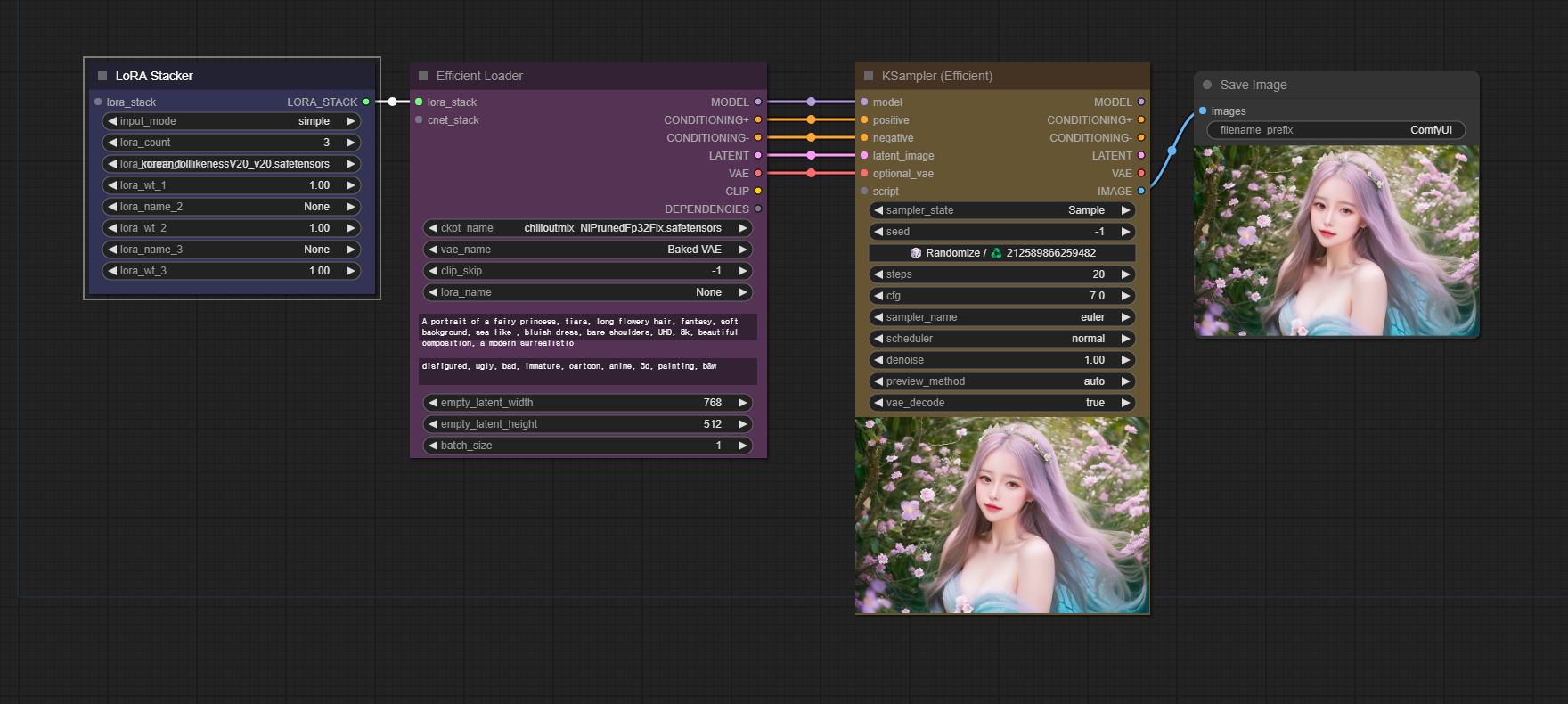 아래는 이 워크플로로 생성한 이미지입니다. 당연히 이 이미지를 ComfyUI 캔버스에 떨어뜨려도 워크플로가 그대로 복원됩니다.