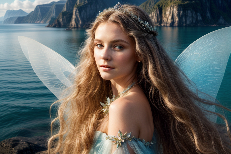 프롬프트: A portrait of a fairy princess, tiara, long flowery hair, fantasy, soft background, sea-like , bluish dress, bare shoulders, UHD, 8k, beautiful composition, a modern surrealistic