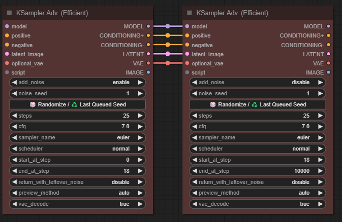다음은 [KSampler Adv. (Efficient)] 노드는 SDXL에서 사용하는 노드입니다. SDXL 모델을 사용할 때 base 모델과 refiner 모델에 대해 각각 잡음 제거 샘플링을 시킬 때 사용하는 노드인 [KSampler Advanced)] 노드에 대한 Efficient 판입니다. [KSampler (Advanced)] 노드는 아래와 같은 형태로 사용합니다. (자세한 내용은 이 글을 참고하세요)
