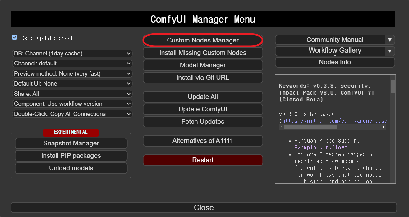 Efficiency 커스텀 노드도 ComfyUI Manager를 통해 설치할 수 있습니다. 화면 맨위에 있는 [Manager] 버튼을 누르면 아래와 같이 [ComfyUI Manger Menu]가 나타납니다.
