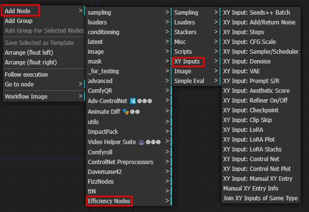 입력 슬롯인 X/Y 에는 아래와 같이 Add Node -> Efficient Nodes -> XY Inputs에 포함된 어떠한 노드를 연결해도 됩니다.