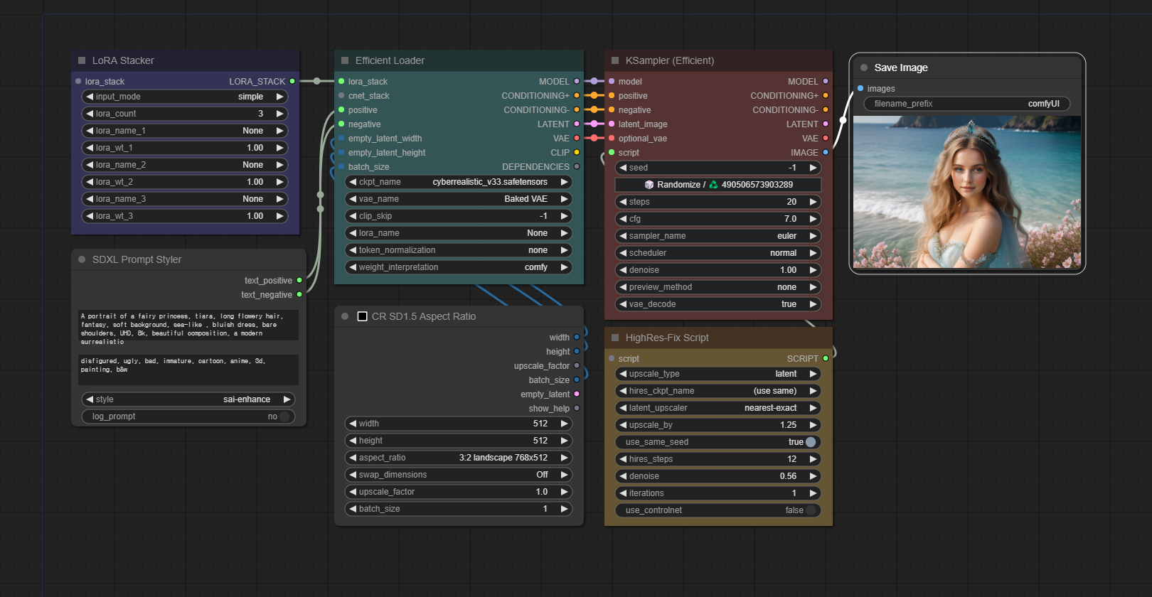 마지막으로 추가한 것은 [HighRes Fix Script] 노드입니다. 확대하면서 보다 섬세함을 추가하기 위한 목적입니다.