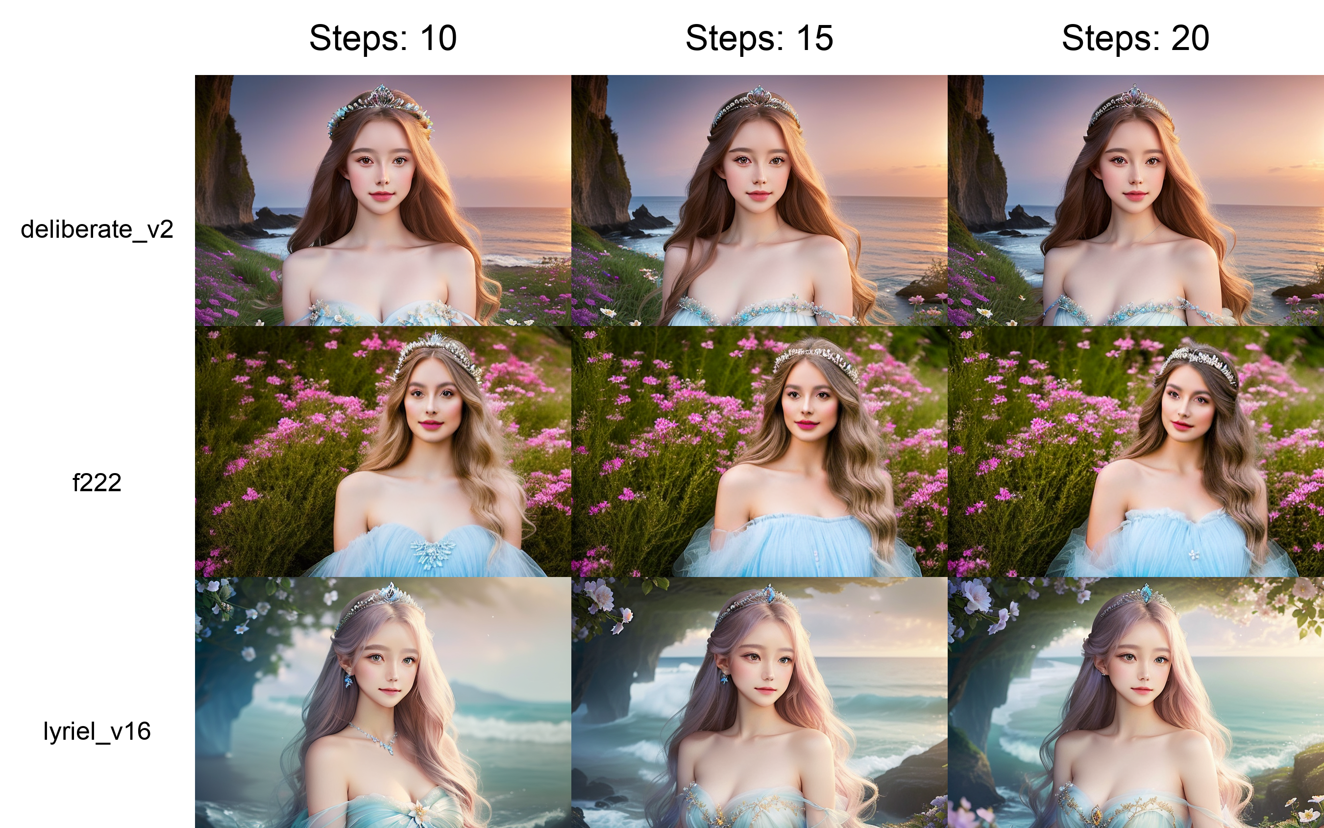 프롬프트: A portrait of a fairy princess, tiara, long flowery hair, fantasy, soft background, sea-like , bluish dress, bare shoulders, UHD, 8k, beautiful composition, a modern surrealistic