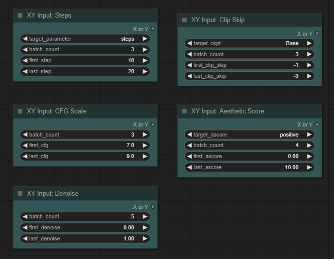 XY Input 노드는 여러가지 종류가 있습니다. 아래는 값을 설정하는 노드들만 모아본 것입니다. 예를 들어 좌측위의 [XY Input: Steps]를 그림과 같이 설정하면 단계수가 10, 15, 20에 대해 이미지를 생성하라는 뜻입니다.