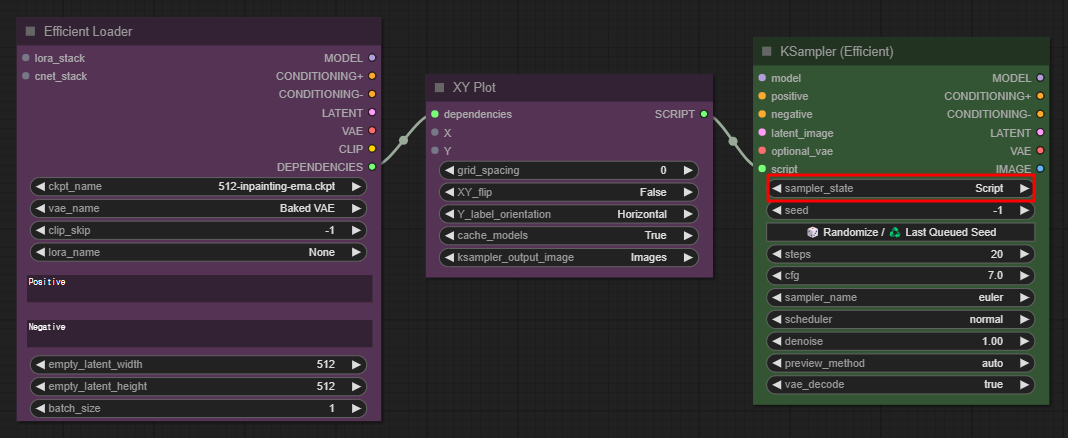 Efficiency Nodes에 포함된 [XY Plot] 노드는 아래와 같이 생겼습니다. 반드시 아래와 같이 연결해야 작동하며, [KSampler (Efficient)] 노드의 "sampler_state" 위젯은 "Script"로 설정해야 합니다.