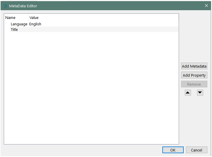 EPUB에서 필수적인 정보는 제목(Title), 저자(Author), 및 언어(Language)이다. 기본적으로 메타데이터 에디터는 위 그림과 같이 언어와 제목 필드를 포함한다.